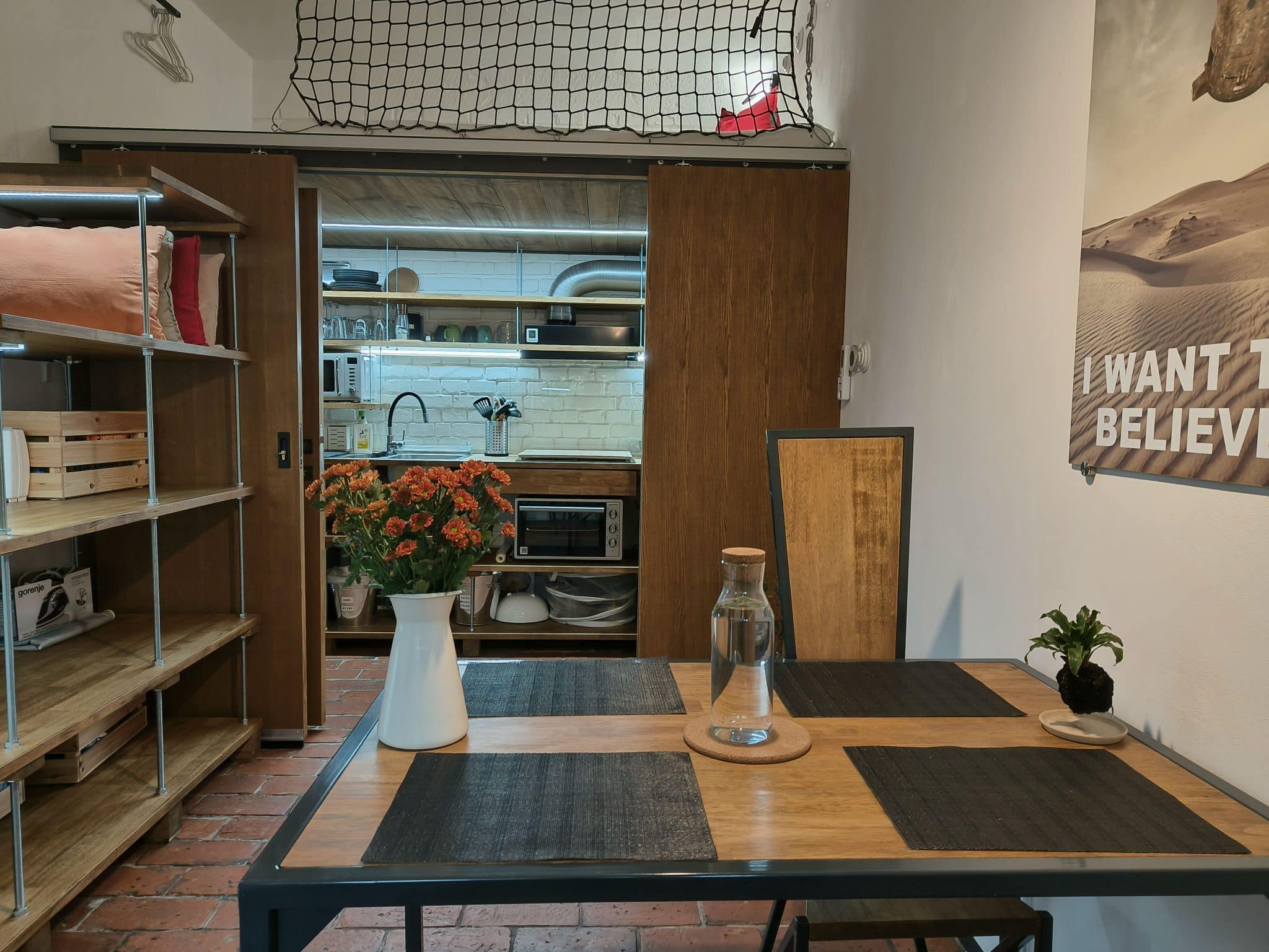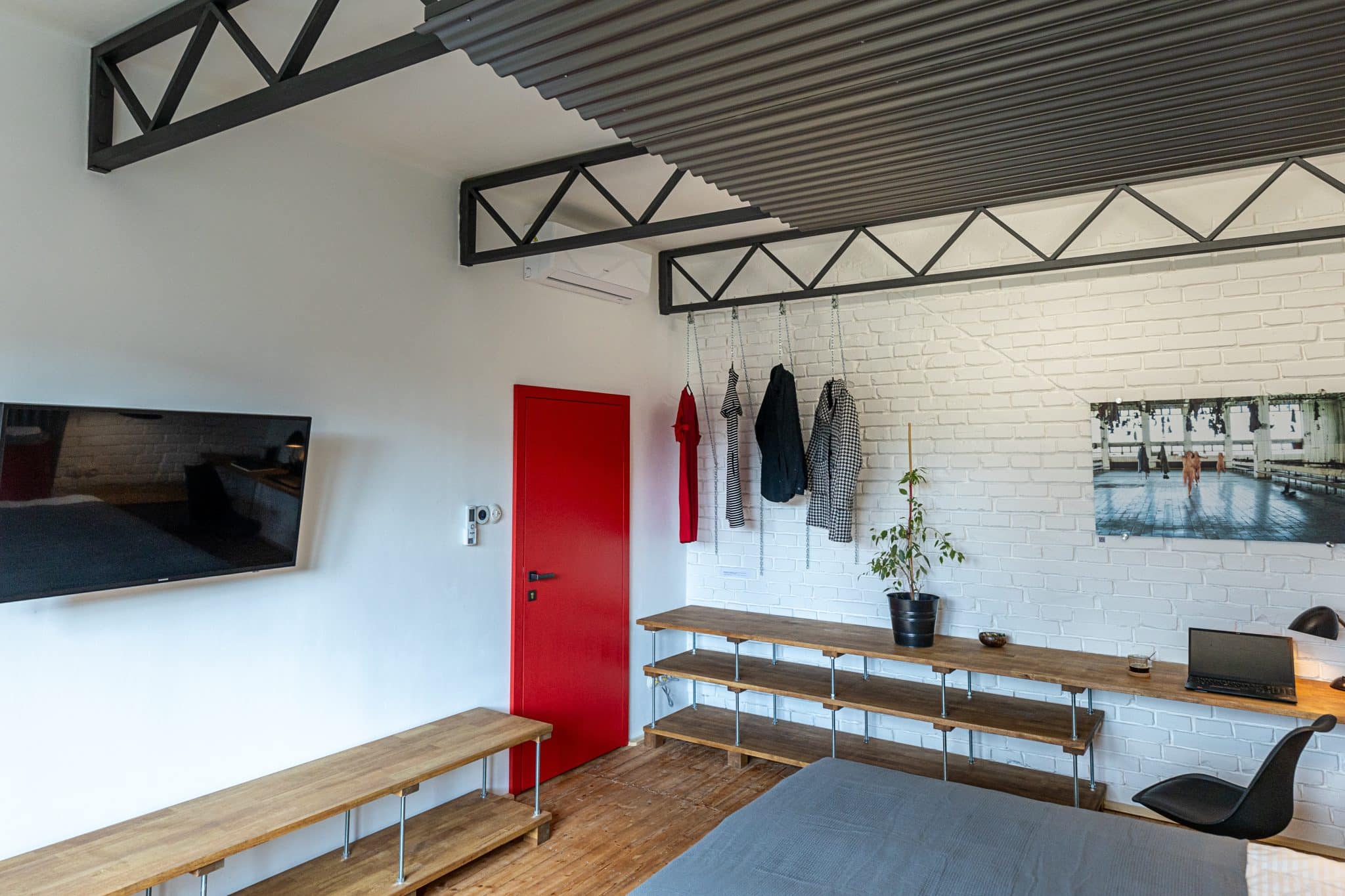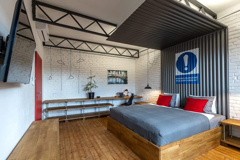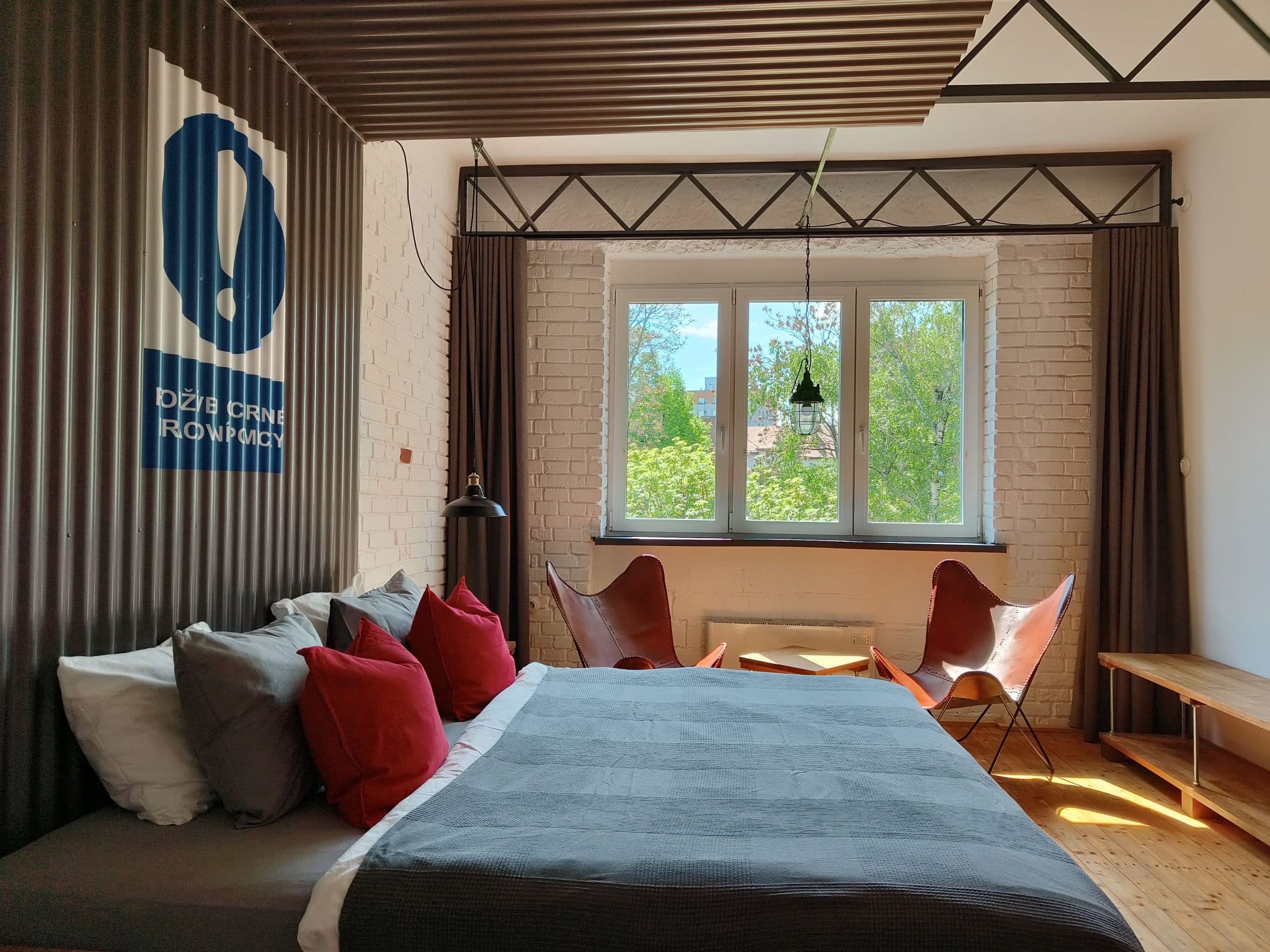 Dominantními materiály jsou cihly, dřevo, kov a sklo. Snažili jsme se o účelné využití prostoru, abychom dosáhli co největší variability pro ubytované hosty. V menší místnosti jsme se inspirovali takzvanými mikrobyty a umístili do ní tři funkční celky (kuchyni, jídelnu, vyvýšené lůžko). Naopak větší místnost působí velkoryse a dominuje jí dvoulůžko (king size) s baldachýnem z vlnitého plechu. Jednu stěnu tvoří pracovní kout a řetízková šatna, která odkazuje na hornickou tradici Ostravy. Stěny koupelny jsou z probarveného gletovaného betonu. Podlahy jsou cihlové a původní dřevěné.