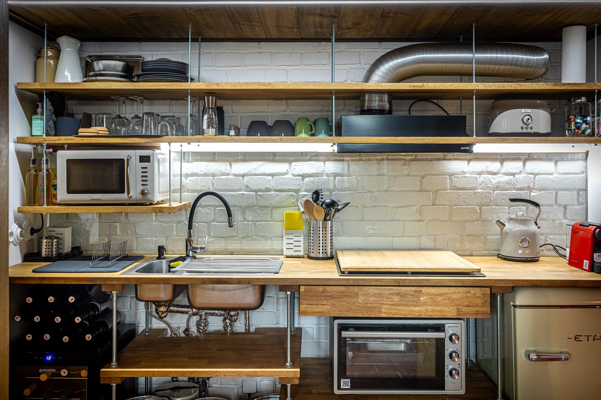 Kuchyně: dřez, indukční deska, pečicí trouba, mikrovlnná trouba, konvice na čaj, kávovar, toustovač, vinotéka, lednice s mrazničkou, nádoby na tříděný odpad