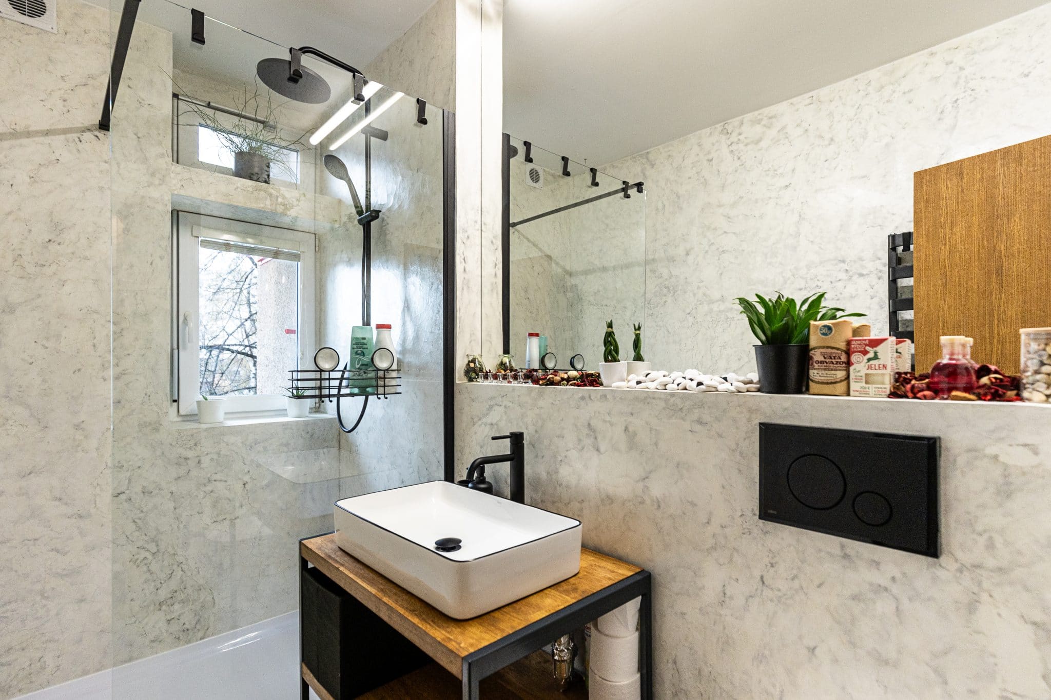 Koupelna: umyvadlo, toaleta, sprchový kout, žebříkový radiátor