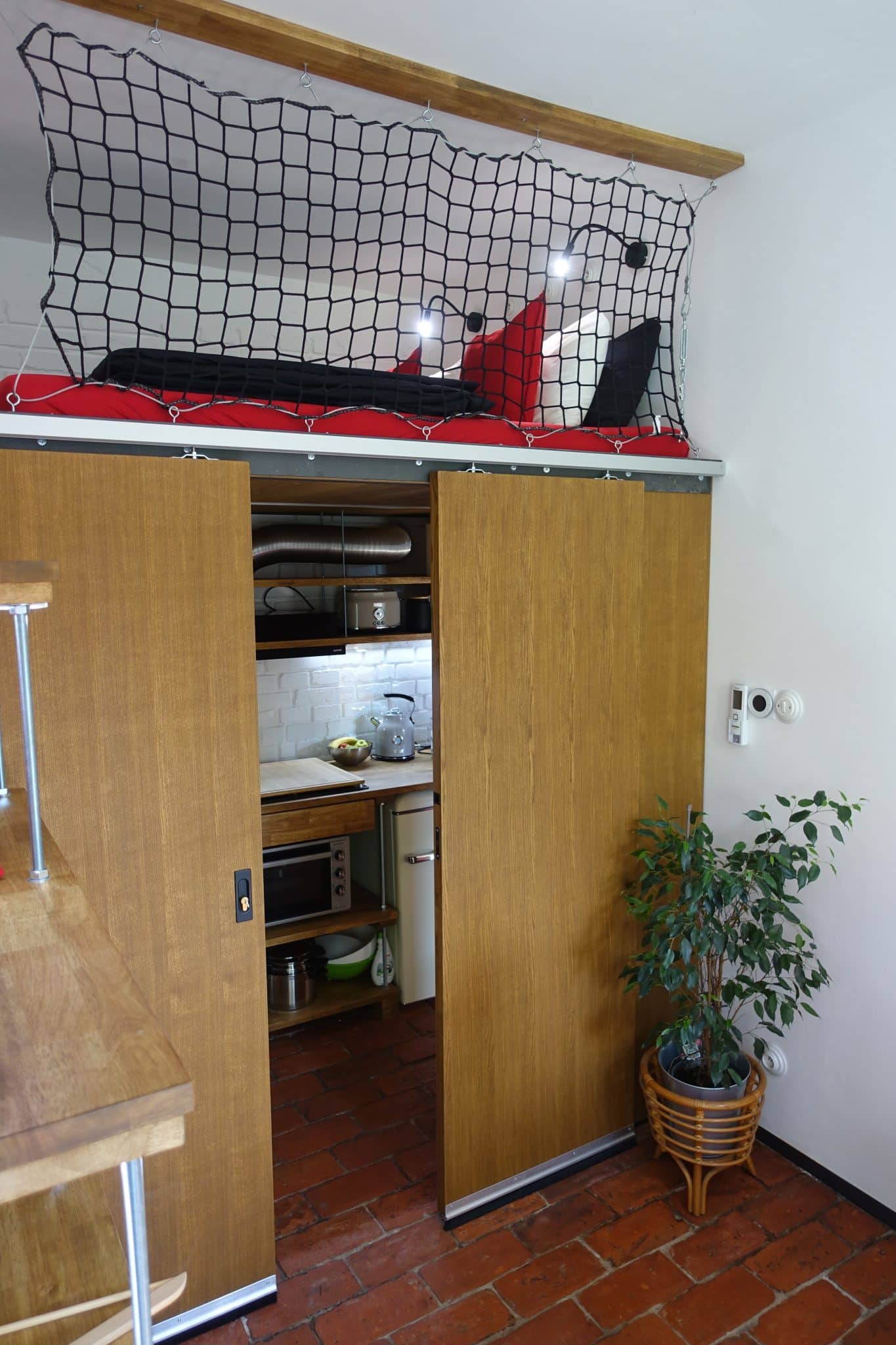 Vyvýšený spací prostor: galerie s dvoulůžkem (výstup po schodoskříni)
